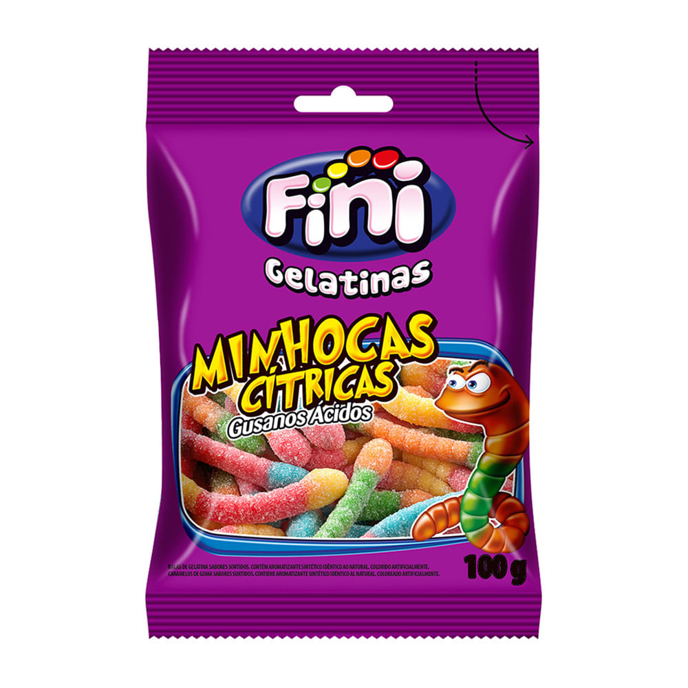 MINHOCA CÍTRICA FINI, formato de minhoca, nas cores vermelho, azul, amarelo, verde e laranja, nos sabores de laranja, framboesa, lima-limão, maçã verde e morango com acabamento cítrico.