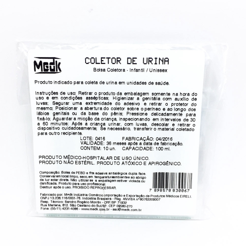 Coletor de Urina Segmed Infantil Unissex: confeccionado com abertura em fita adesiva antialérgica dupla face, para fixação na pele do paciente, com orifício oval (3,8cm de comprimento x 2,7cm de largura. Coletor de tamanho único (17cm x 10cm) e marcações aproximadas com intervalos graduais de 10ml até 100 ml. Contém campo para preenchimento e identificação de pacientes. Produto destinado à coleta de urina para exames laboratoriais. Anvisa n° 80762209007.