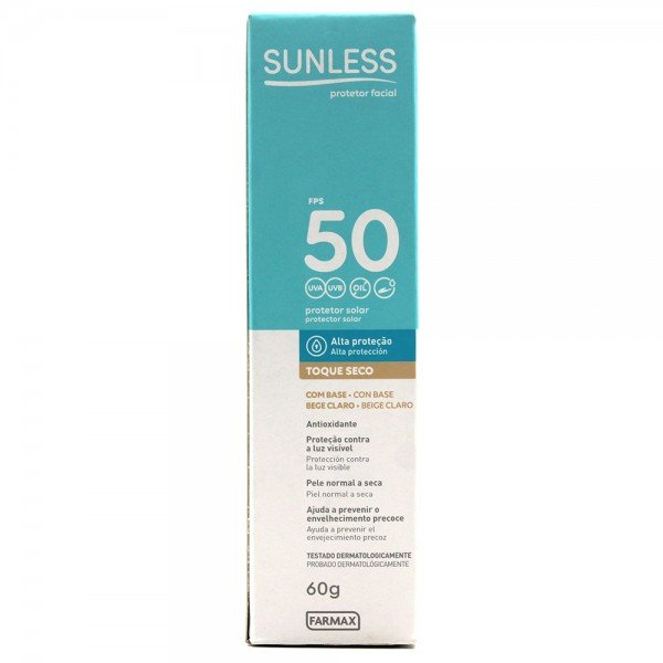 PROTETOR SOLAR SUNLESS COM BASE BEGE CLARO FPS 50 TOQUE SECO COM EFEITO DE BASE