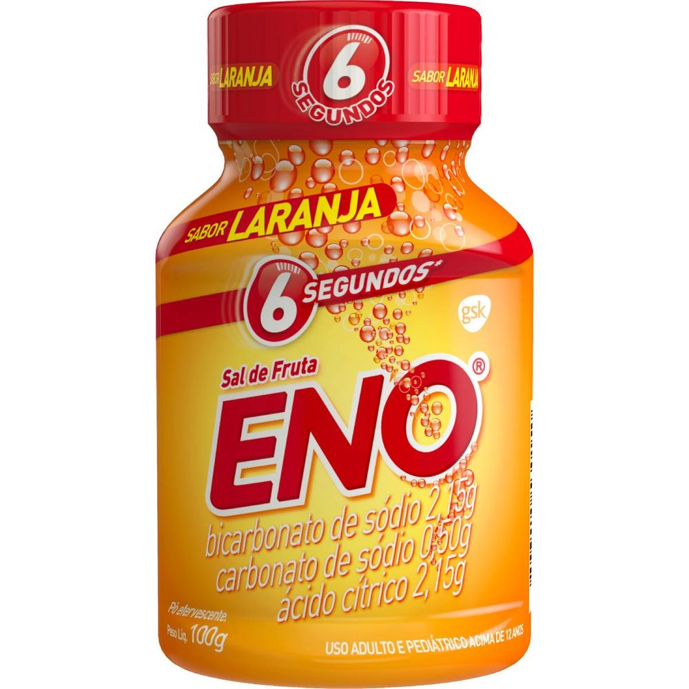 Eno Sal de Fruta Laranja é um antiácido indicado azia, má digestão e outros transtornos estomacais, tais como excesso de acidez do estômago e indigestão ácida. Os componentes do Sal de Frutas Eno Laranja, quando dissolvidos em água, reagem entre si, produzindo um sal de efeito antiácido, capaz de iniciar a redução da acidez do estômago em 6 segundos.