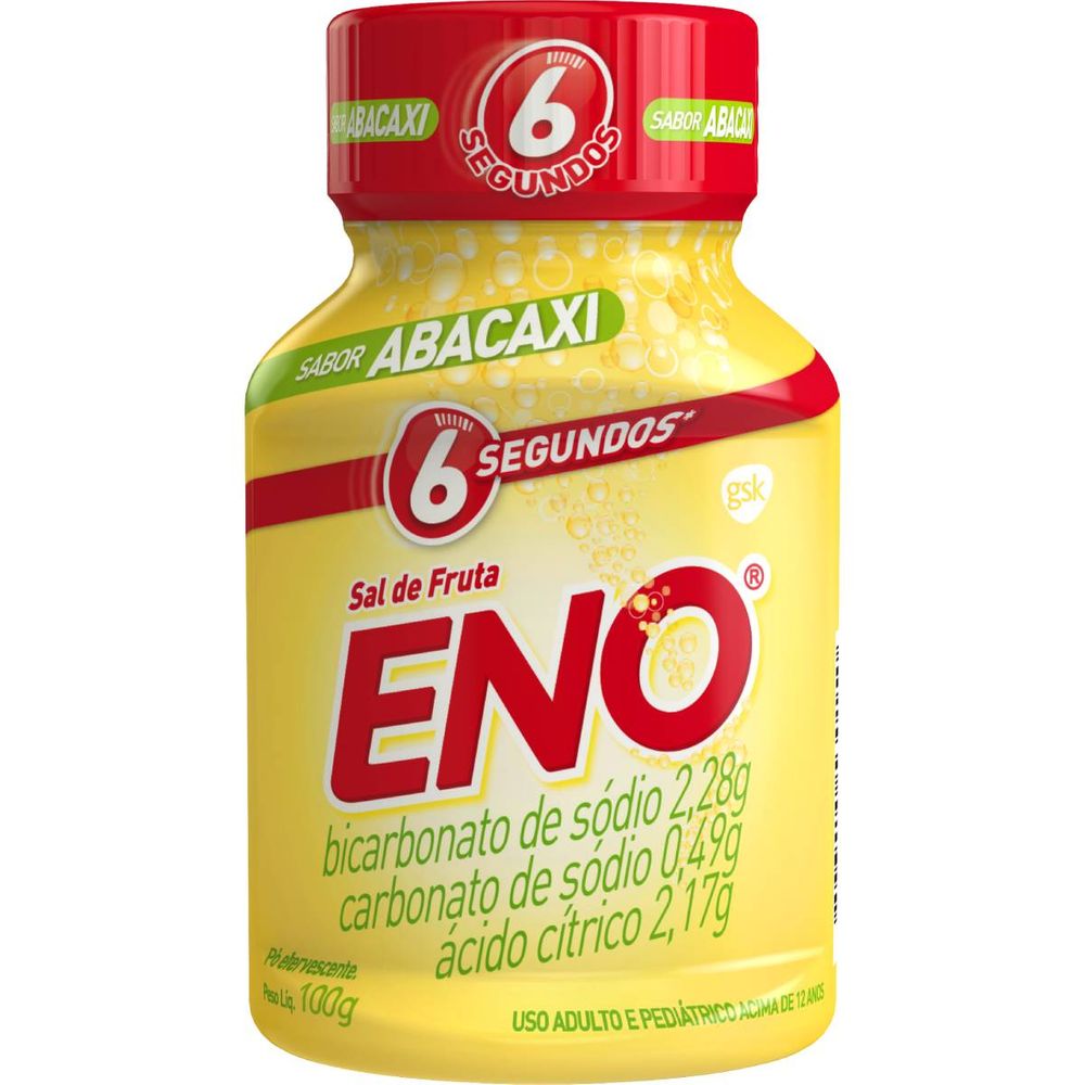 Eno Sal de Fruta Abacaxi é um antiácido indicado para azia, má digestão e outros transtornos estomacais, tais como excesso de acidez do estômago e indigestão ácida. Os componentes do Sal de Frutas Eno Abacaxi, quando dissolvidos em água, reagem entre si, produzindo um sal de efeito antiácido, capaz de iniciar a redução da acidez do estômago em 6 segundos.