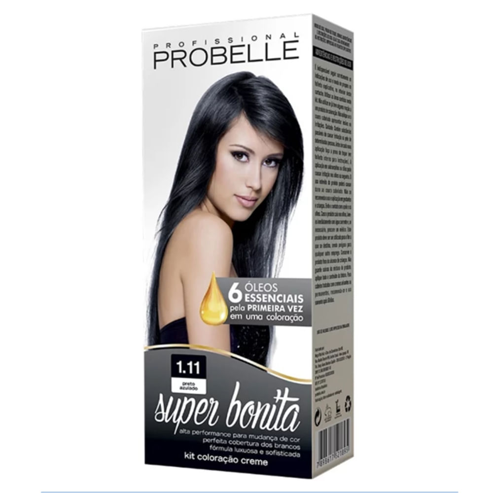 Tintura Super Bonita Probelle Kit Duplo Preto Azulado 1.11Produto feito com fórmula altamente luxuosa e sofisticada com altíssimo poder colorante, revelando e intensificando a cor com ação de alta duração. Também leva um blend de 6 óleos essenciais, mantendo os cabelos nutridos ao longo do processo. Kit Possui